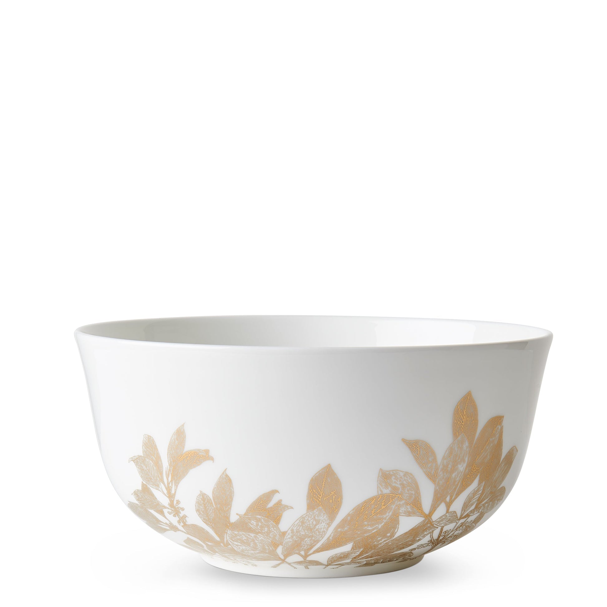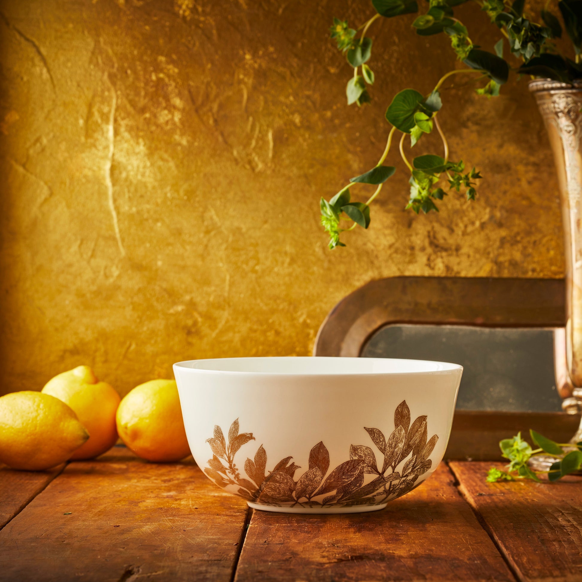 Detailed drawings inspired by antique botanical engravings are rendered in softly glowing, self-burnished gold. This serving bowl is wrapped in delicate leaves and branches, reflecting the light ever so subtly. Sized to serve a crowd and designed to last a lifetime, these pieces are made for everyday living.